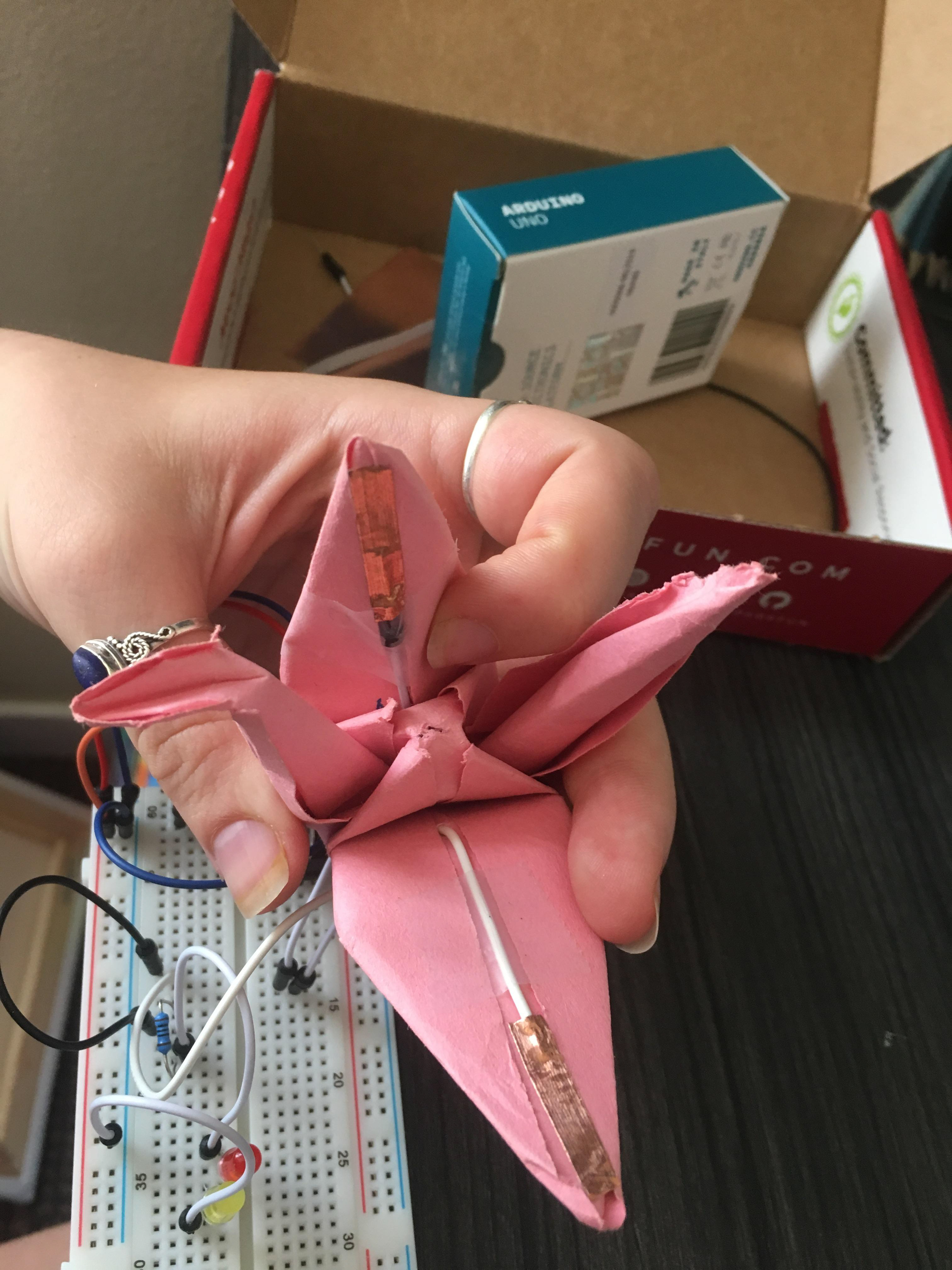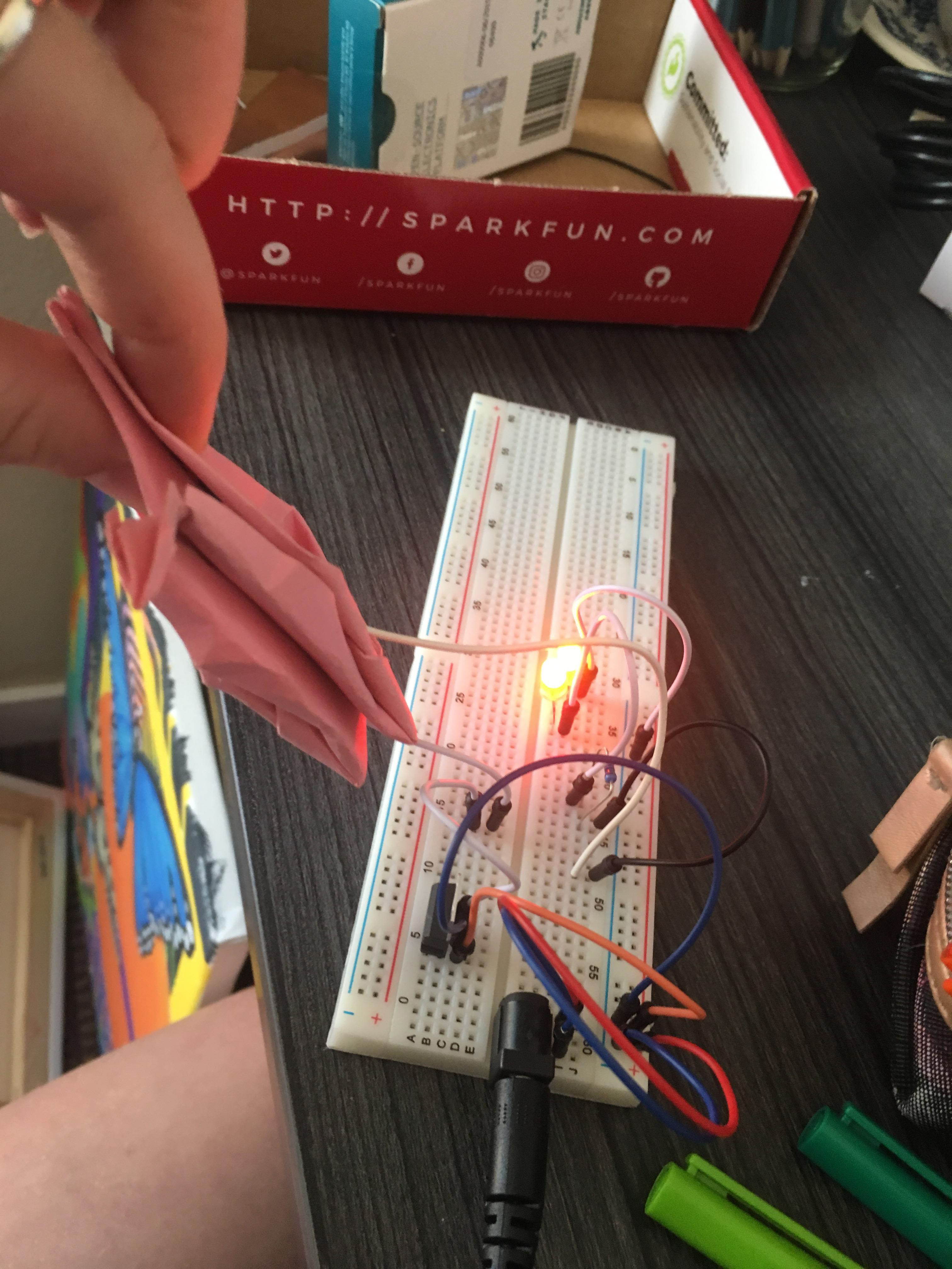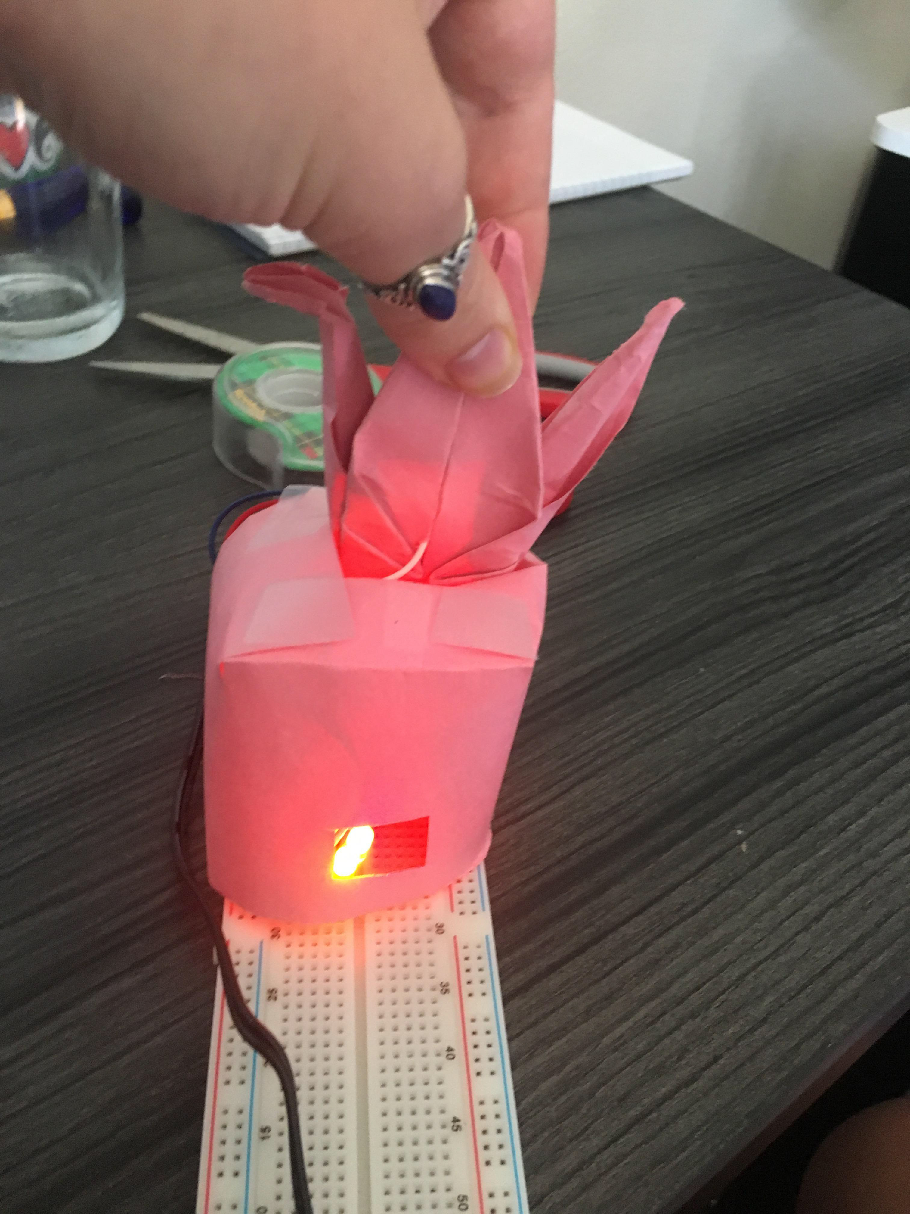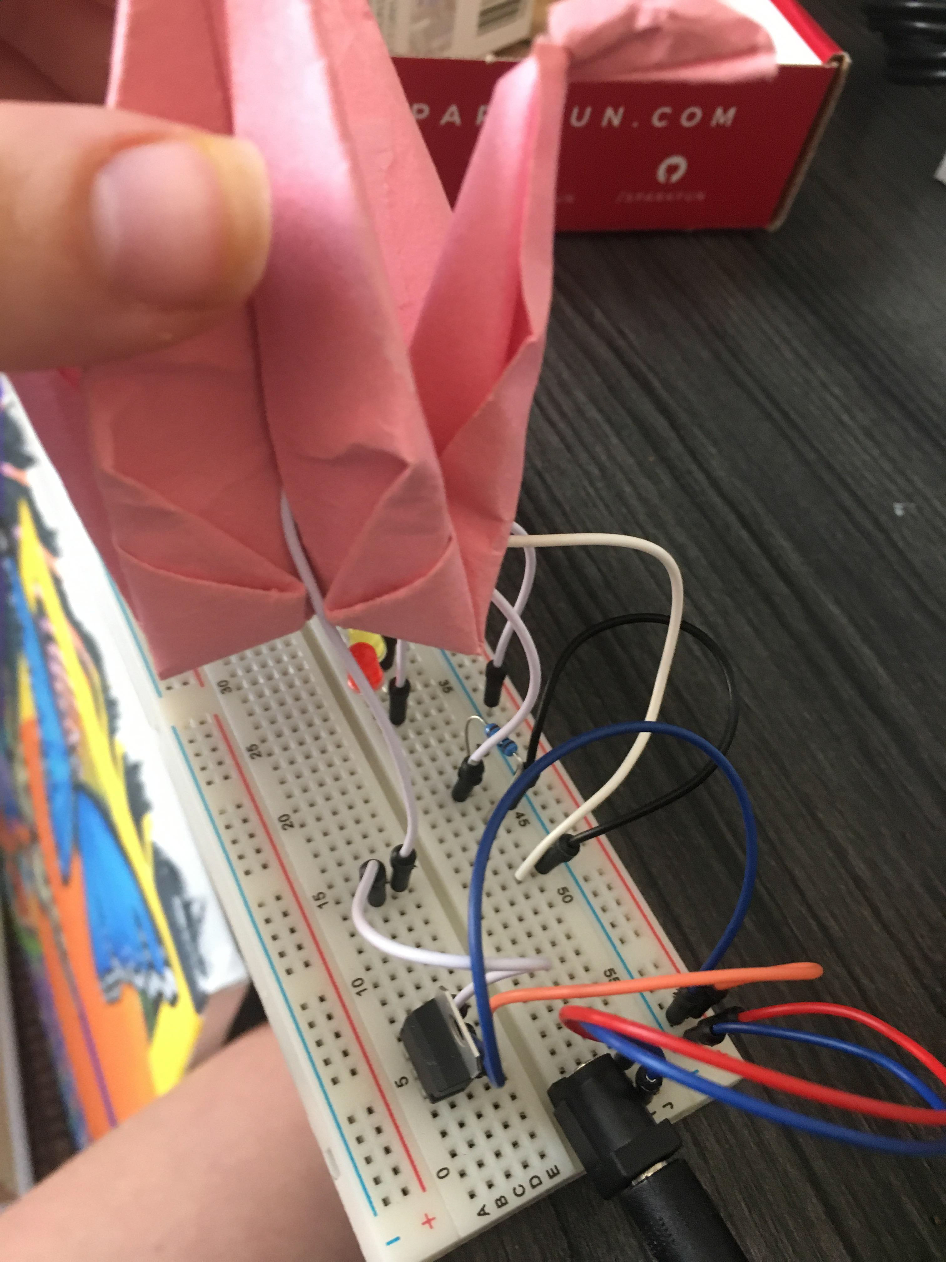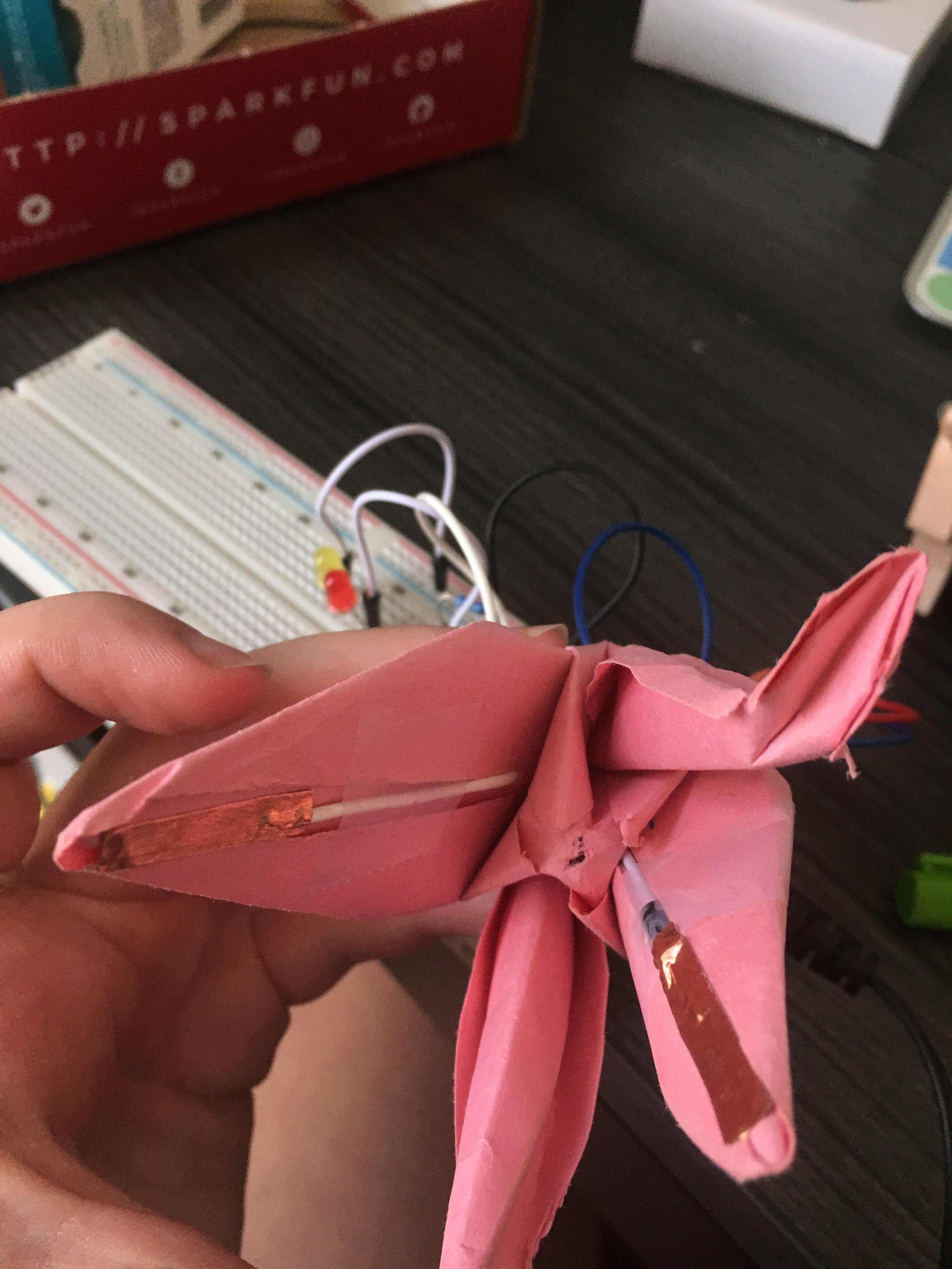 For the second part, we were tasked with replacing our current mechanical switches with a creative custom switch. I decided to use copper tape, wires and my paper crafting skills to create a paper crane switch.