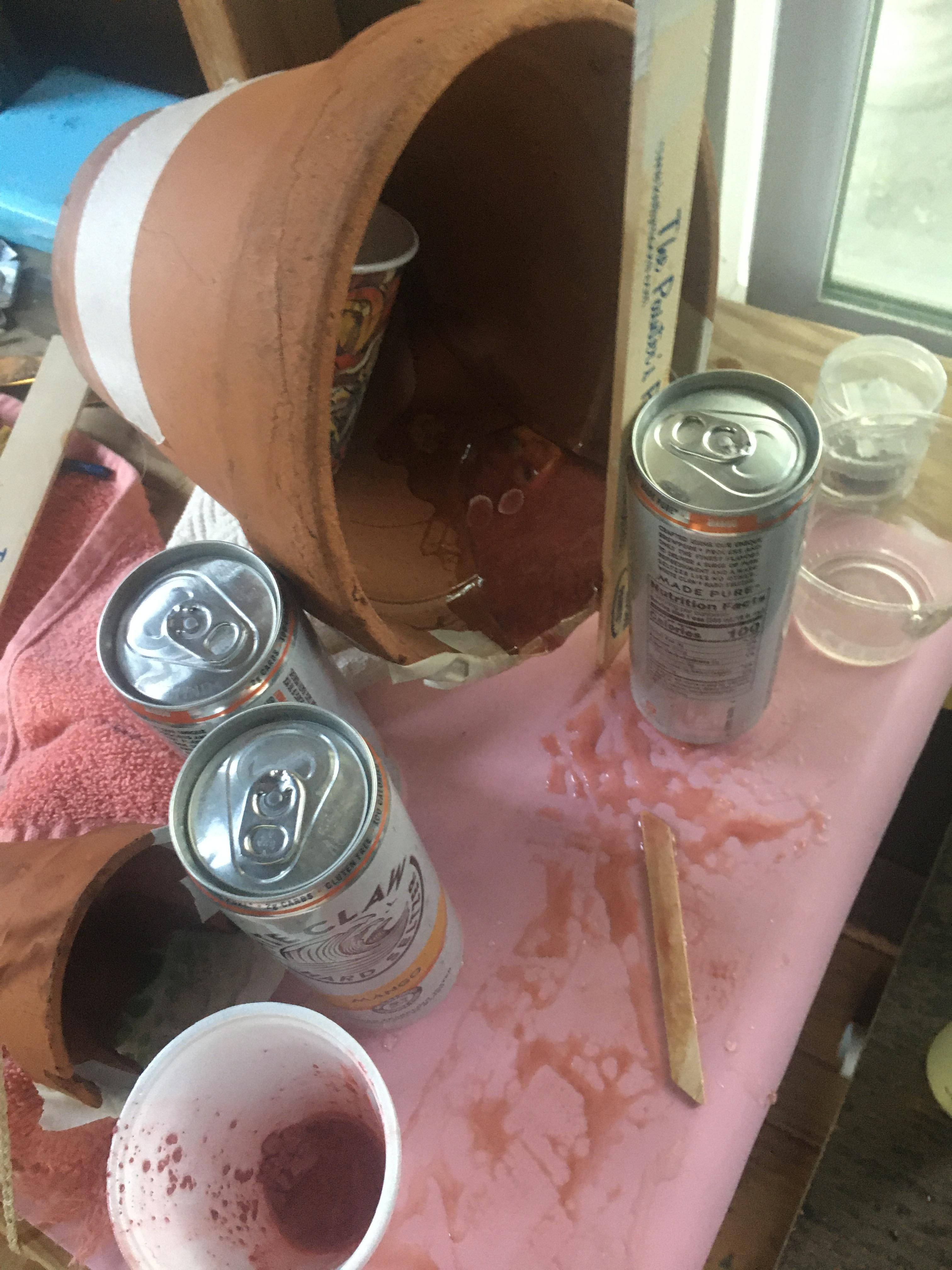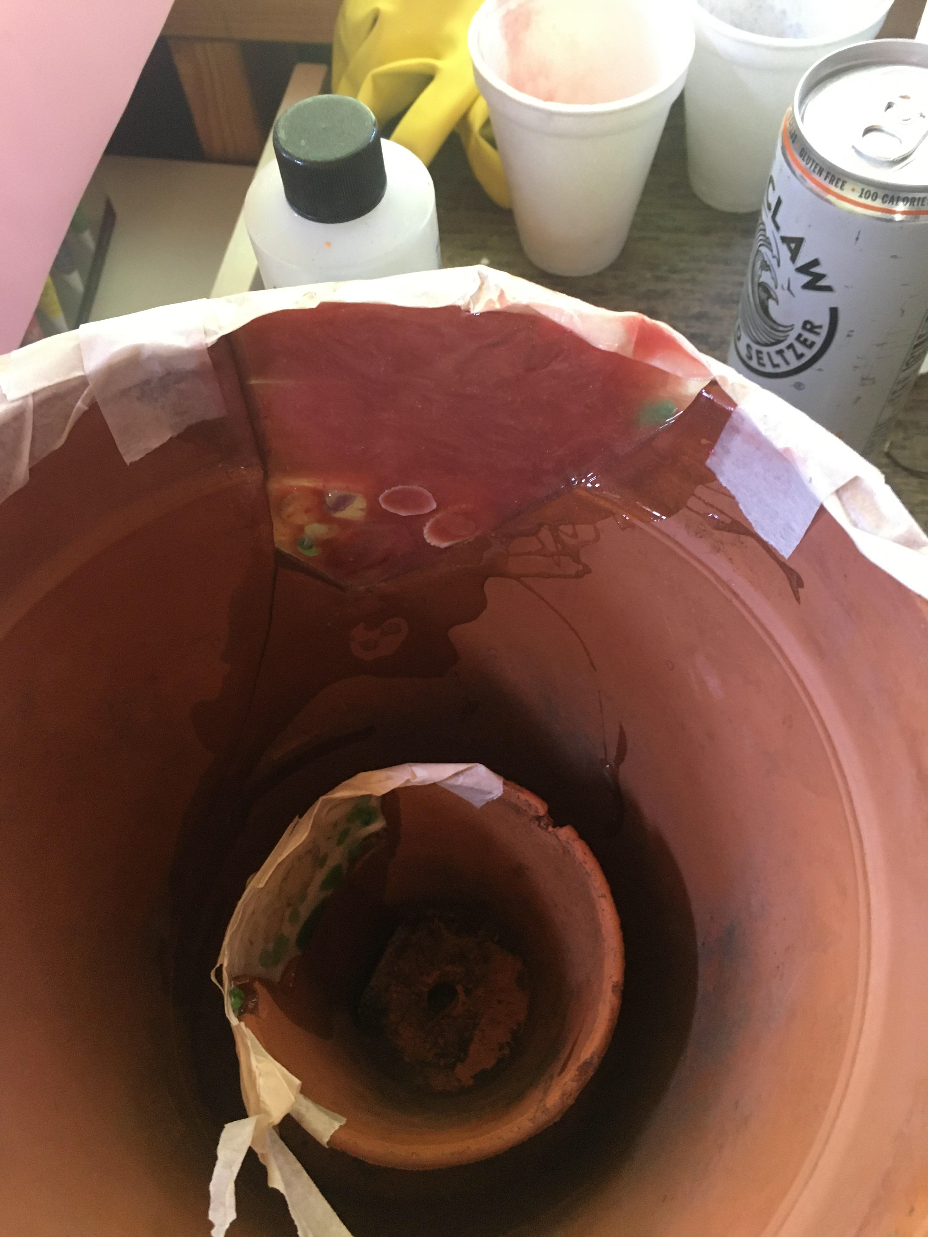 To start fabricating, I first needed to clean off the pottery. By this time, I had also dropped and cracked another smaller pot so I decided to add that to the project as well. I washed them down with a hose, then scrubbed off the dirt on the outside and around the areas I would cast the epoxy. I let these dry thoroughly in the sun before proceeding.